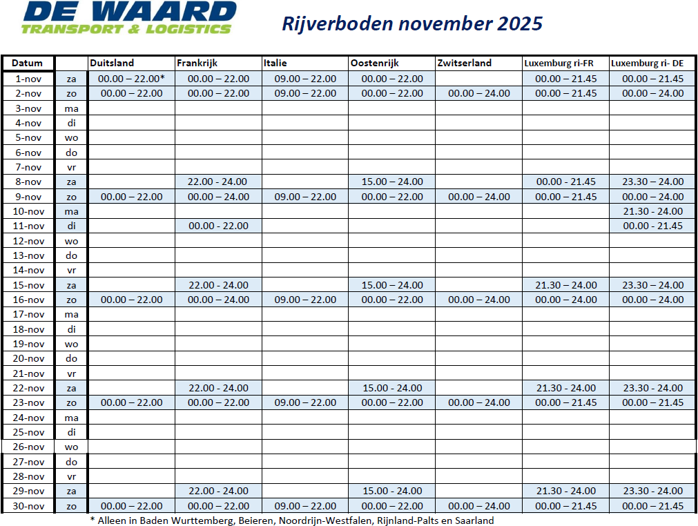 Rijverboden gelden op zaterdagen, zon- en feestdagen voor voertuigen met een toegestaan totaalgewicht van meer dan 7,5 ton voor het algemeen goederenvervoer. Door alle verschillende feestdagen en regelgeving per land kunnen de afspraken soms erg onduidelijk zijn. Hier op deze pagina vindt u de rijverboden die voor ons het meest gangbaar zijn. Uiteraard hebben deze verboden invloed op de los- en leverdata, dit zal in overleg met u op de best mogelijke manier afgestemd worden.