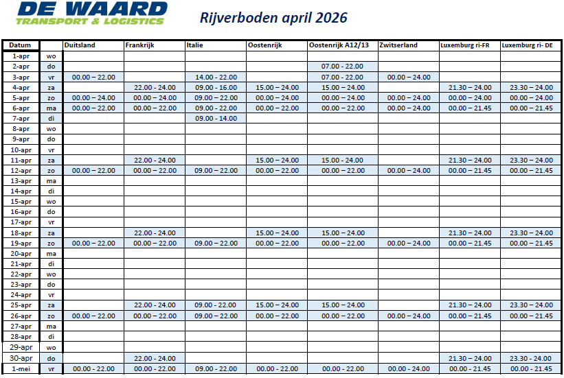 Rijverboden gelden op zaterdagen, zon- en feestdagen voor voertuigen met een toegestaan totaalgewicht van meer dan 7,5 ton voor het algemeen goederenvervoer. Door alle verschillende feestdagen en regelgeving per land kunnen de afspraken soms erg onduidelijk zijn. Hier op deze pagina vindt u de rijverboden die voor ons het meest gangbaar zijn. Uiteraard hebben deze verboden invloed op de los- en leverdata, dit zal in overleg met u op de best mogelijke manier afgestemd worden.