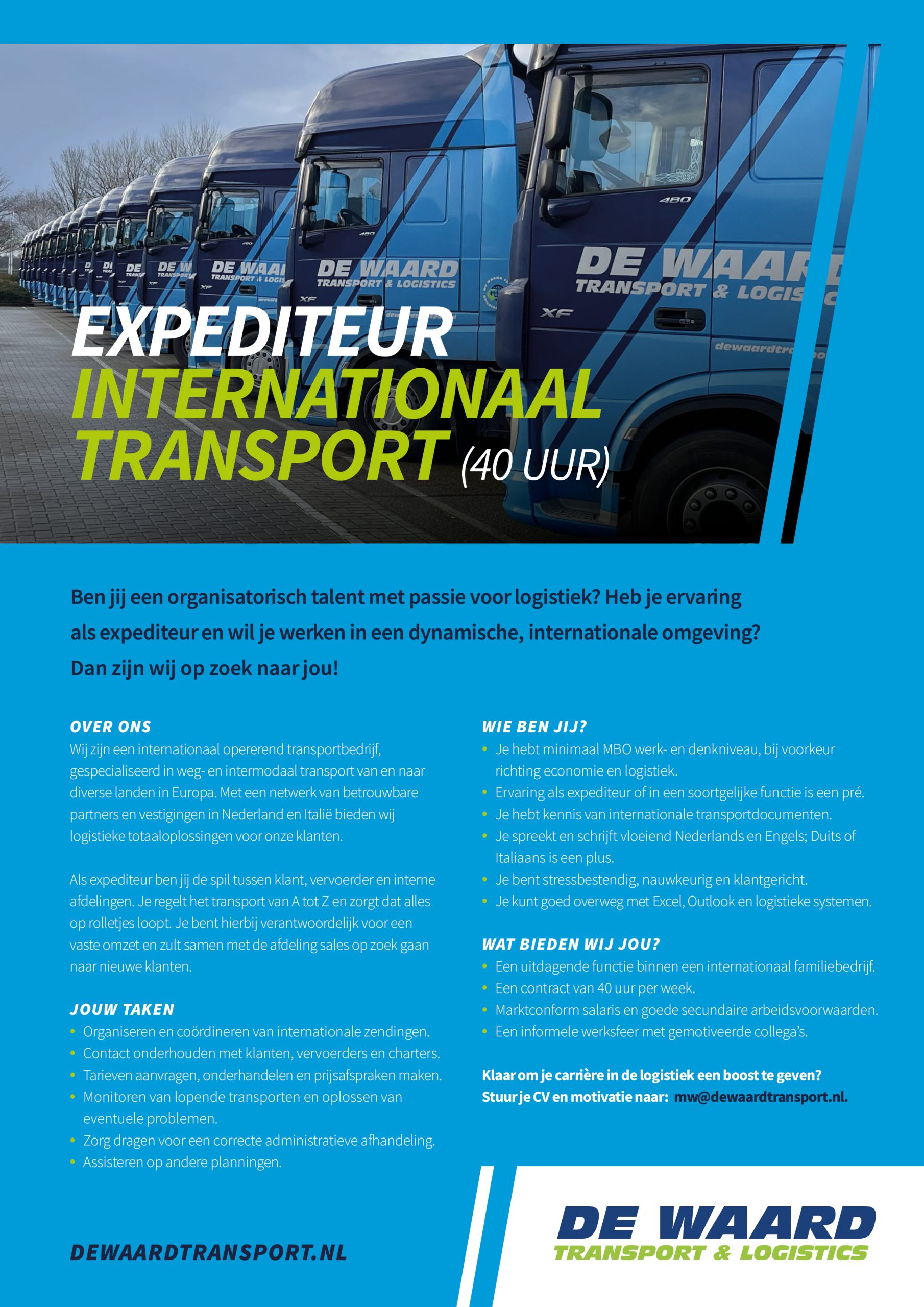 Vacature – Expediteur Vacature Expediteur Enthousiast? Functie —Kies een optie—Vacature ExpediteurHoofd AdministratieVacature Nationaal ChauffeurAllround Chauffeurs CE (parttime)Internationaal chauffeur CETransportplanner (M/V)Loodsbeheerder Naam * E-mailadres * Telefoonnummer * Woonplaats * Waarom is de vacature geschikt voor jou? Tweet